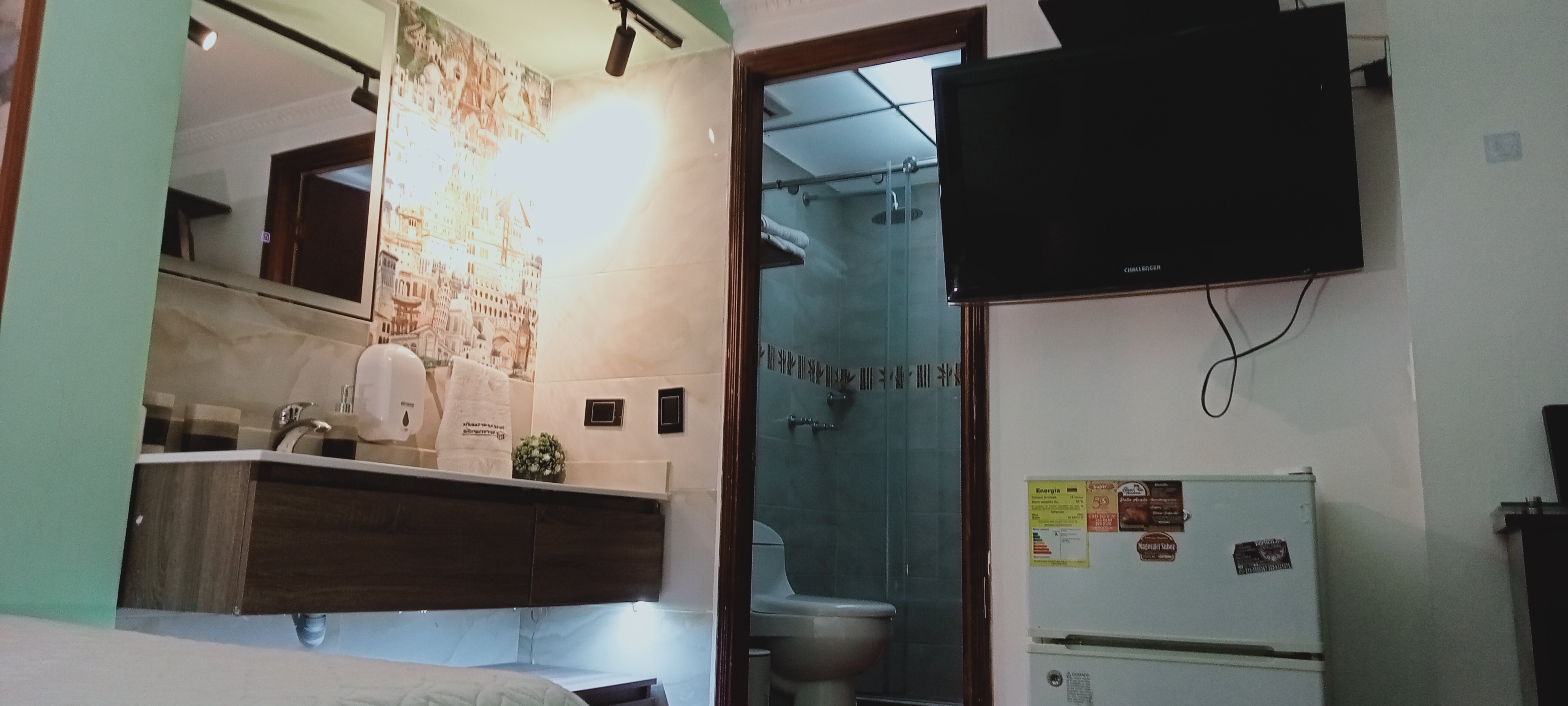 El baño privado está equipado con cabina en vidrio templado, una ducha de efecto lluvia, artículos de aseo de alta calidad, salida de agua tipo bide y toallas suaves y esponjosas.