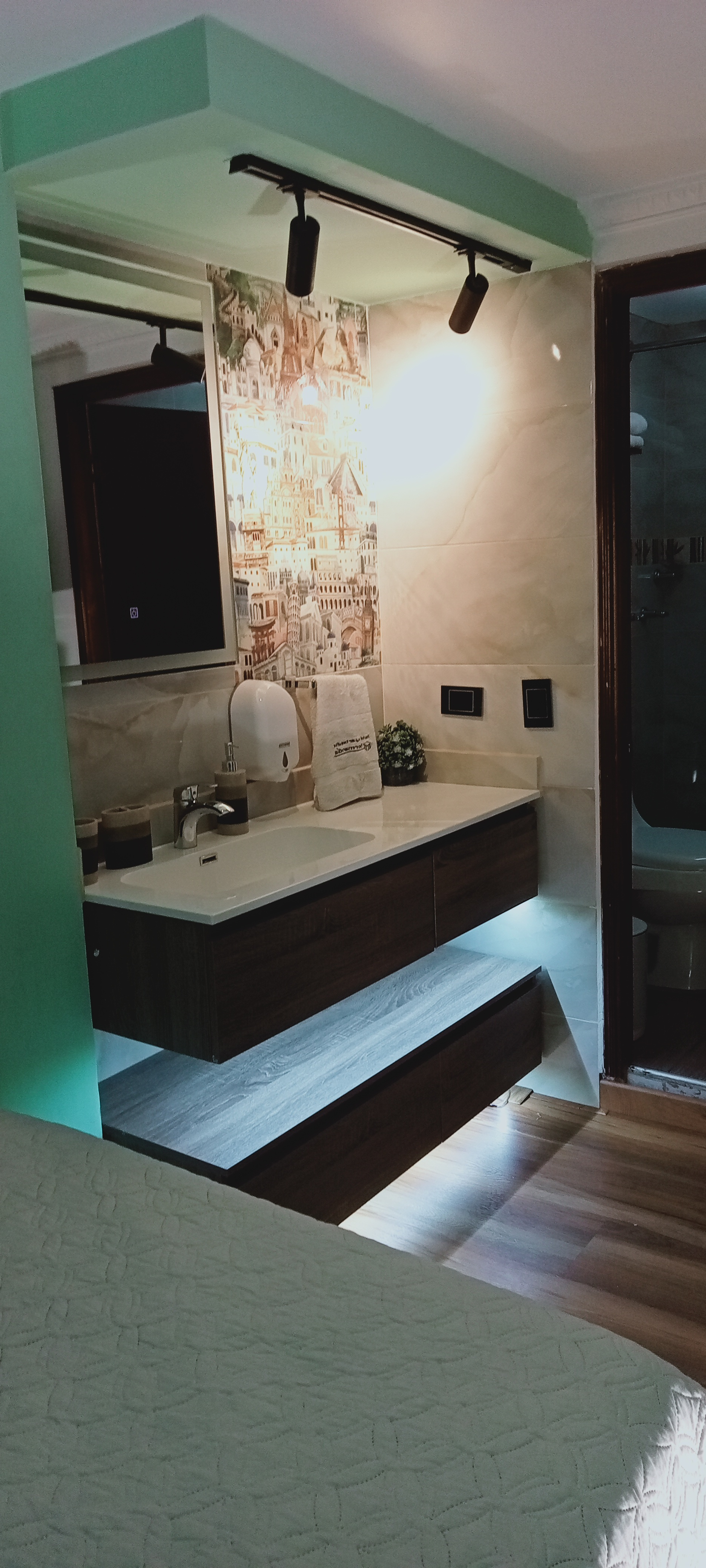 El baño privado está equipado con cabina en vidrio templado, una ducha de efecto lluvia, artículos de aseo de alta calidad, salida de agua tipo bide y toallas suaves y esponjosas.